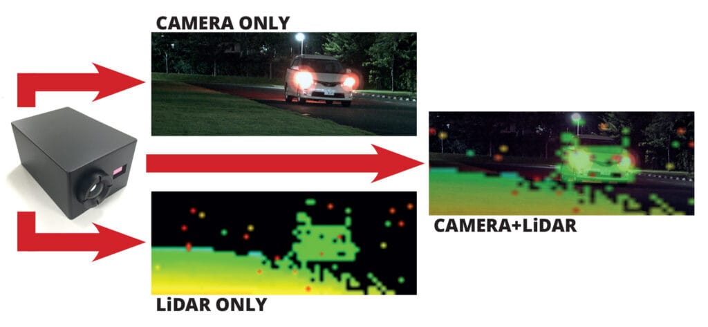 Kyocera’s approach is to use a common lens for both camera and LiDAR sensor, combined into one unit. Its patented Camera-LiDAR Fusion Sensor combines a camera with LiDAR to provide highly accurate images in realtime. With a single unit, the process of integrating camera and LiDAR data is greatly simplified, allowing timely and accurate object detection with no delay to improve driving safety. And, because both devices use the same lens, the camera and LiDAR signals have identical optical axes, resulting in high-resolution 3D images with no parallax deviation.