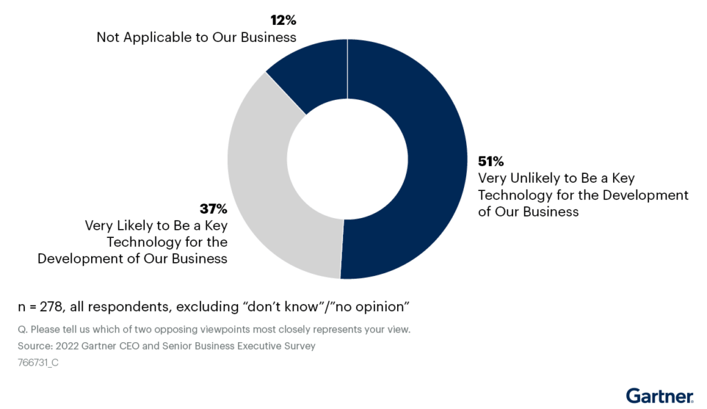 AI is reported as the most impactful new technology among CEOs for the third year in a row while CEOs see the metaverse as not particularly interesting from a business perspective. Neither digitalization nor e-commerce, in second and fourth place respectively, is very new on a relative basis but these are technologies that many business leaders still perceive as novel and disruptive in their situations.