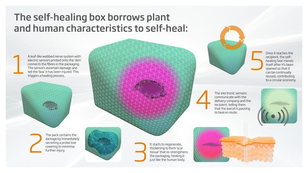Regenerative “scar tissue:” Healing itself just like the human body, the surface stretches and thickens to cover the injury. It then transmits data to the delivery company and the recipient to tell them it is pausing to heal itself en route.