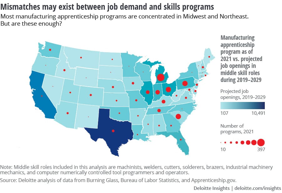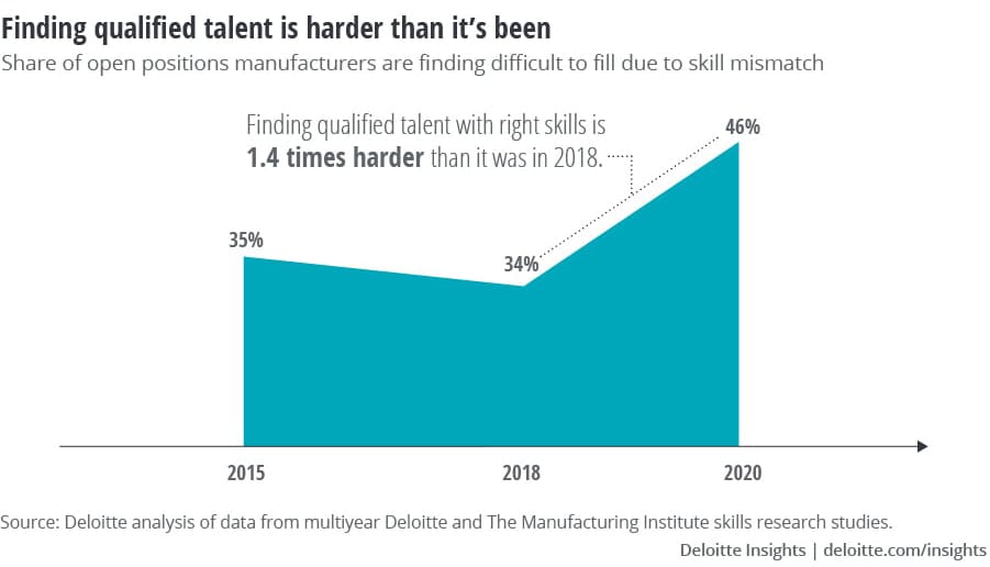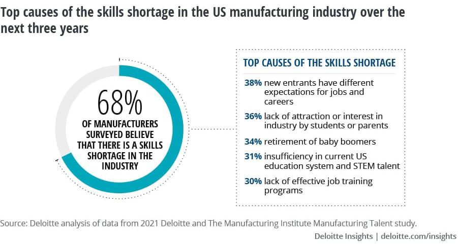 The pandemic, the changing employee-employer relationship, the economy—it’s all part of what’s happening in workforce as a whole, but the manufacturing space in particular is suffering. A 2021 study by Deloitte and The Manufacturing Institute anticipated that 2.1 million manufacturing jobs could go unfilled by 2030 due to skilled labor shortages and a wave of baby-boomer retirements.